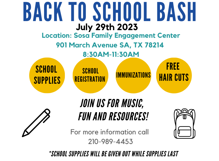 Harlandale ISD will be hosting its annual Back to School Bash at the Sosa Center on Saturday, July 29, 2023 to help families check off the final items on their back to school checklist at the convenience of one location.