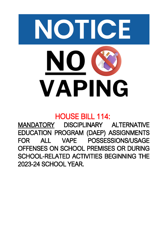 Under HB 114, school districts are required to place a student in an Disciplinary Alternative Education Program (DAEP) if it finds that the student possesses, uses, is under the influence of, sells, gives, or delivers marijuana, THC, or e-cigarettes on or near school property or at school-sponsored events. This includes possession of any part or accessory of an e-cig device.