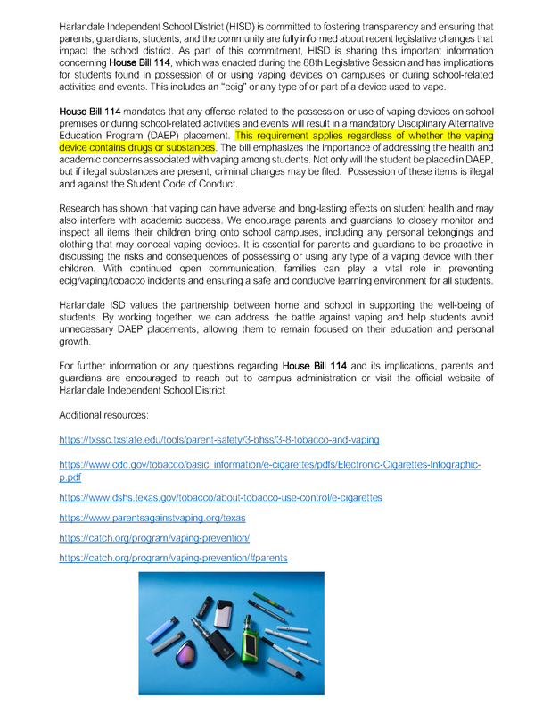 We encourage parents and guardians to talk to their children about the dangers of drug use and alcohol abuse. We also encourage parents and guardians to contact their school district if they have any questions about HB 114.